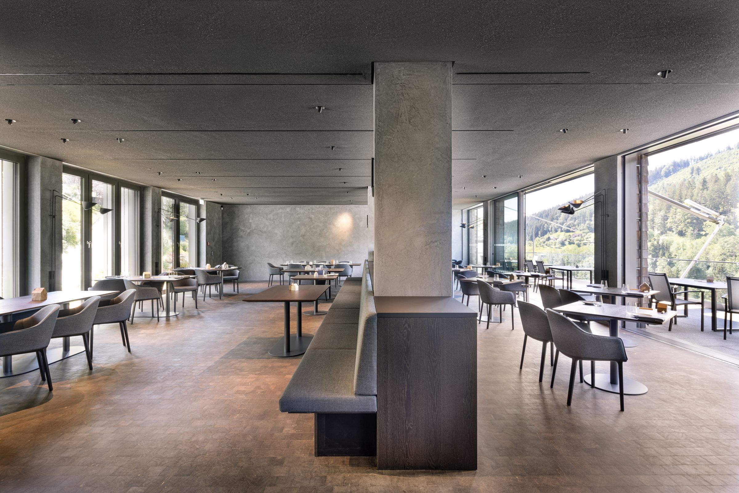 V souladu s touto architekturou je také fasáda, směřující k silnici spíše uzavřená, zatímco na straně směřující do údolí otevírají velkoformátová okna a terasy překrásný výhled do okolní krajiny. Také při úpravě architekti sáhli po tradičních materiálech, jako jsou šedé dřevěné šindele, hrubá omítka a pálené střešní tašky. Řemeslné zpracování na nejvyšší úrovni: to je to, co dnes představuje obnovený hotel Traube Tonbach v Baiersbronnu. To platí jak pro kulinářské umění špičkové kuchyně, tak pro samotnou budovu. Se svými důmyslně řešenými fasádami a interiéry, včetně velkých akustických stropů, nabízí dokonalé prostředí pro prvotřídní kulinářské zážitky.