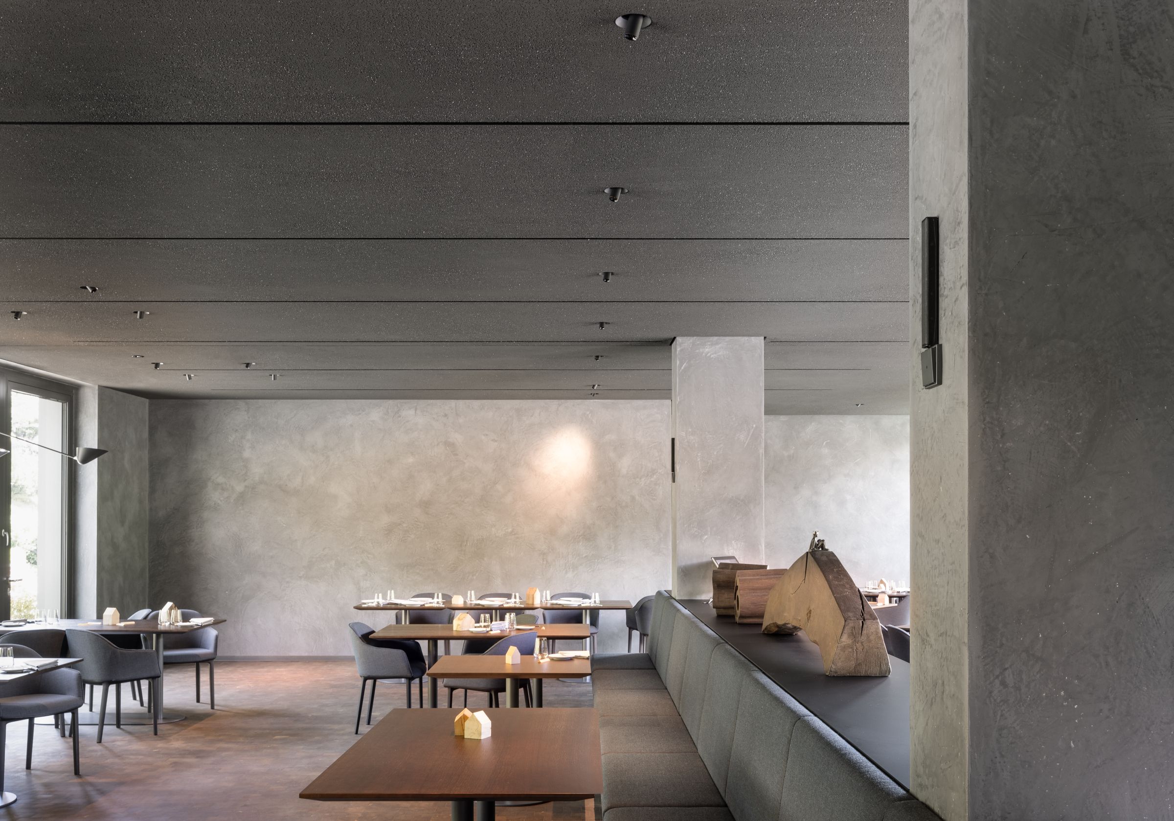 Koncepce interiéru se neomezuje pouze na vizuální vzhled. Jde také o akustické podmínky otevřených velkých jídelen. Koncept byl od samého počátku navrhován s ohledem na to, co v restauracích, barech či kavárnách často chybí: akustika, která hraje v místnostech pro hosty důležitou roli. Ucho, dalo by se říci, jí s vámi. Strop hlavní budovy je nyní nejen akusticky precizně vyvážený, ale také architektonicky dokonale začleněný do struktury místnosti. Vzhledem k tomu, že provozovatelé již měli výborné zkušenosti se systémem StoSilent, rozhodli se využít toto systémové řešení i pro novou budovu. Pro běžně strukturované povrchy stropů byl použit zavěšený nehořlavý akustický podhledový systém StoSilent Distance S. Použitím světlé bezespárové povrchové úpravy StoSilent Decor M vznikly homogenní, harmonické stropní plochy, do kterých výrobce dokonale integroval filigránská LED svítidla a větrací otvory.