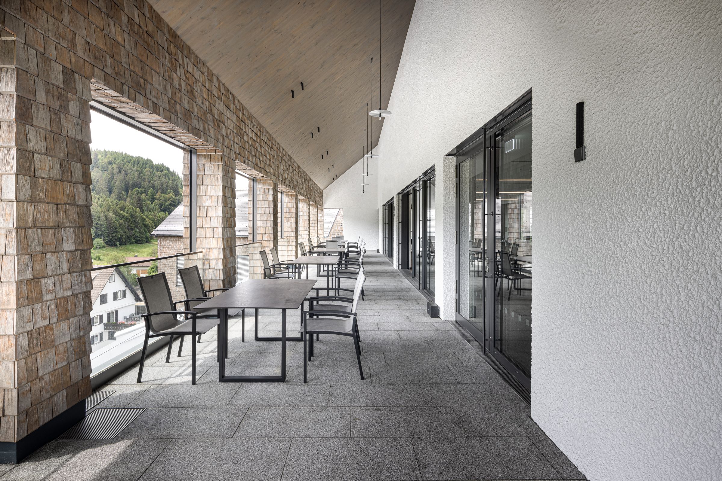 Zatímco dřívější hlavní budova byla historicky rostlou stavbou schwarzwaldského typu, nová hlavní budova se prezentuje jako soubor tří jasných, moderních a mírně posunutých staveb. Namísto stísněnosti historické budovy nyní převládá transparentnost, otevřenost a široké výhledy. Formální redukce se zrcadlí v rafinovaných površích s překvapivými kontrasty hrubé a jemné haptiky - uvnitř i venku. Nová stavba nehistorizuje a je oproštěna od schwarzwaldských klišé; sebevědomě se prezentuje jako současná architektura, a přitom harmonicky zapadá do sousedství vesnice.