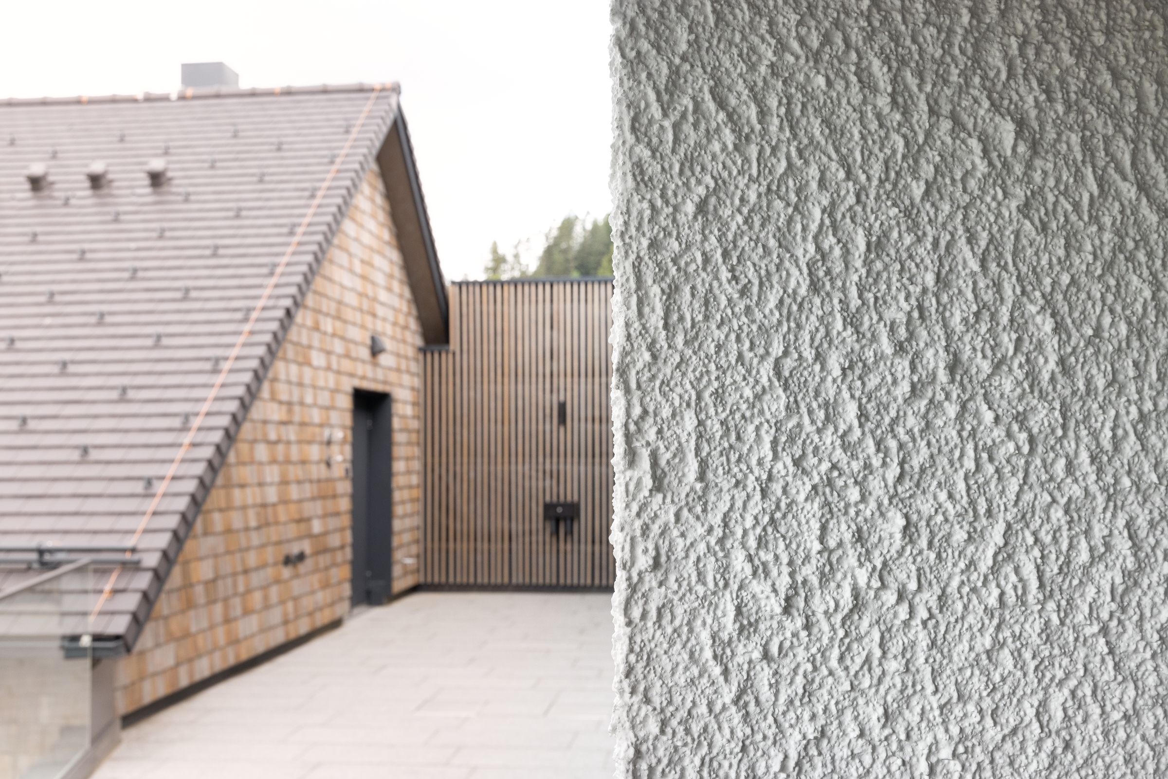 Velké části fasády (včetně podhledů) jsou obloženy modřínovými šindeli typickými pro tento region v nejrůznějších formátech – v kombinaci s tmavými okenními rámy a bílou, výrazně hrubou fasádní omítkou ve škrábané struktuře. Nejedná se však o "pravou" škrábanou omítku, jejíž aplikace je technicky složitá, ale o moderní variantu, která optimálně splňuje dnešní požadavky na hospodárnost a praktičnost. Základem je organická finální omítka Stolit K o zrnitosti 6.